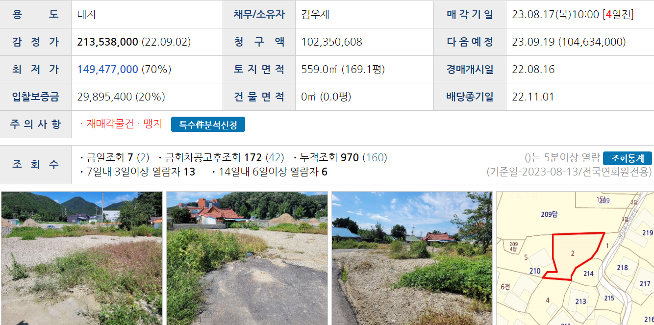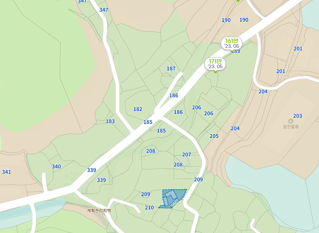 잘해야 평당 75만원 짜리 169평, 즉 1억 2600짜리 땅을 소유하고 있던 210-2 토지주는 맹지를 탈출하면서 평당 150만 원짜리 땅을 156평 소유하게 되니 땅값이 2억 3400으로 늘어나게 됩니다.