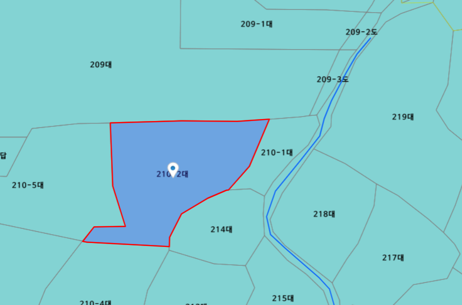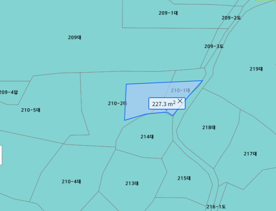 남북으로 난 도로(하늘색 실선)에 접하기 위해서는 210-1 혹은 214 토지가 필요한데요.