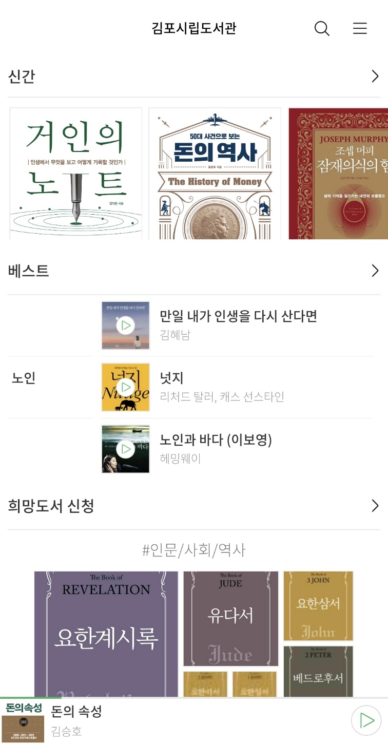김포의 경우 총 769권의 오디오북이 등록되어 있고 등록권수는 지자체 마다 다른 듯합니다. 플레이 버튼으로 스트리밍으로 들으셔도 되고 미리 다운받아 인터넷 연결이 되지 않는 곳에서 들으실 수도 있습니다. 총 100권까지 대출이 가능하고 대여 기간이 지나면 자동으로 반납처리 되는 시스템입니다.