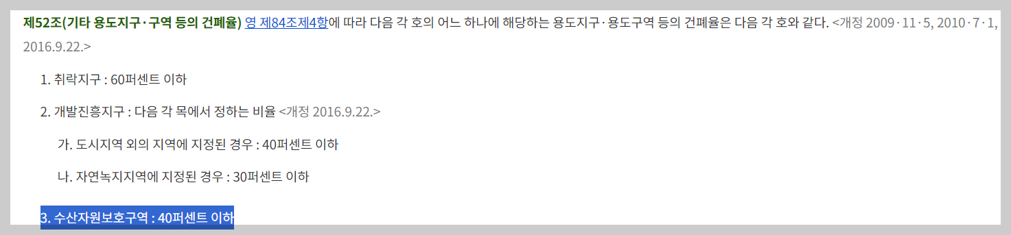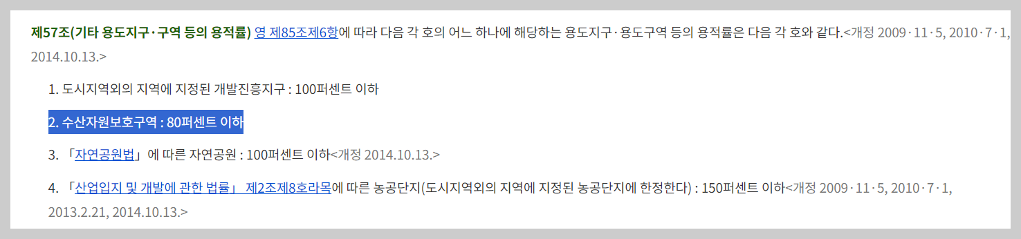 제52조 와 제57조에서 수산자원보호구역의 건폐율은 40%, 용적률은 80%라는 것을 확인가능합니다.