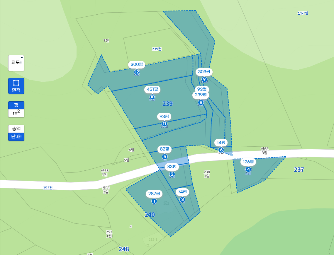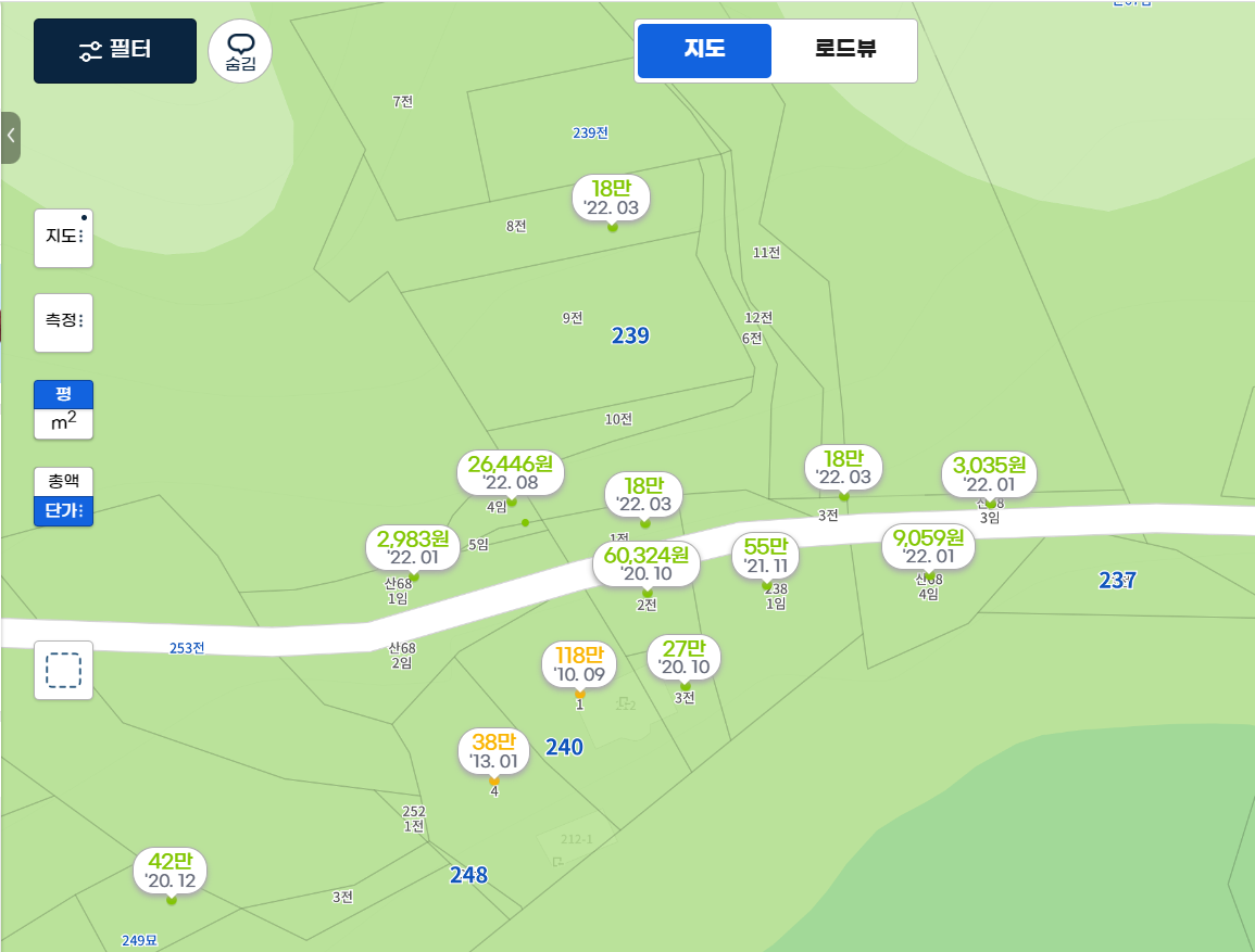 북측 토지주는 작년에 평당 18만 원에 토지를 매수했고, 동서 측 토지주가 동측의 산 68-3, 산 68-3을 매입한 가격은 만원이 안됩니다.