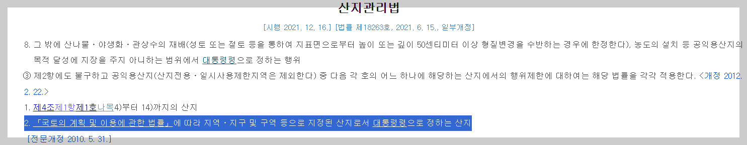 12조 3항에 2에 공익용산지의 행위제한을 적용하지 않고 [국계법]의 제한을 적용하는 '대통령령' 링크로 연결됩니다.
