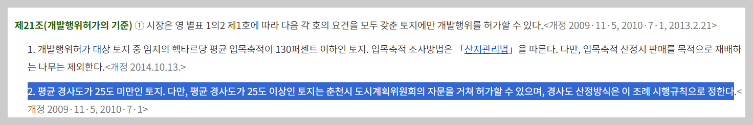 춘천시 도시계획조례상 경사도는 25도 미만입니다.