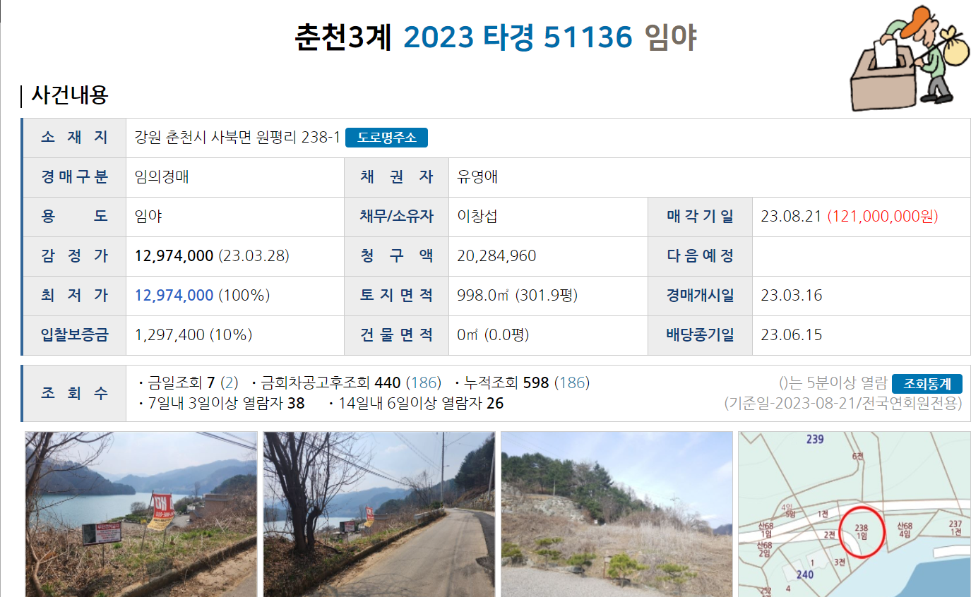 북한강을 남쪽으로 바라보는 '감정가 1200만원의 저렴한 건축가능한 300평의 임야'라는 타이틀로 경매 유튜버 분들이 소개해주셔서 많은 분들의 관심이 쏠렸던 것 같습니다.