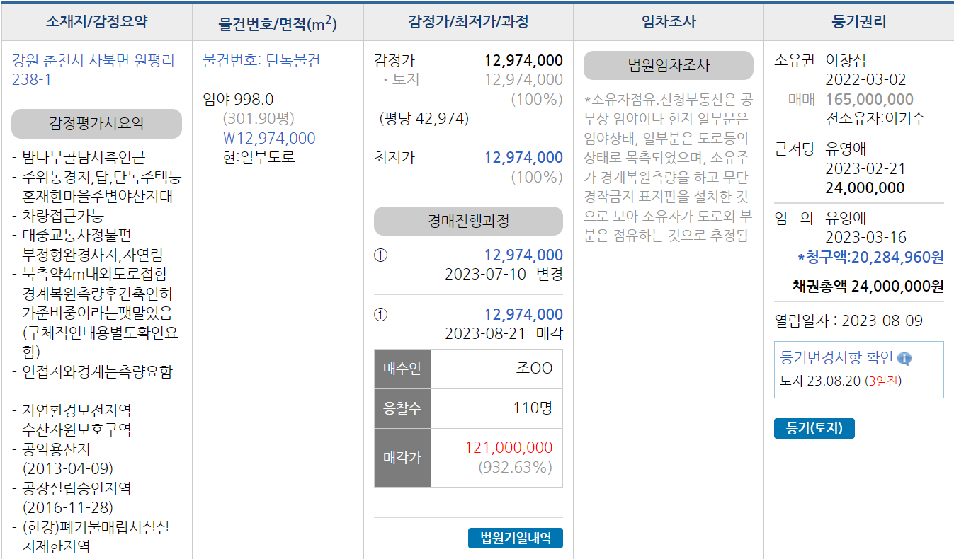 결국 110명이 입찰해서 1억2100만원, 감정가의 932%를 쓰신 분이 낙찰되셨습니다.