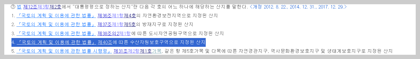 산지관리법 시행령 40조 7항의 4에서 수산자원보호구역은 공익용 산지의 행위제한을 받지 않는다는 것을 확인할 수 있죠.