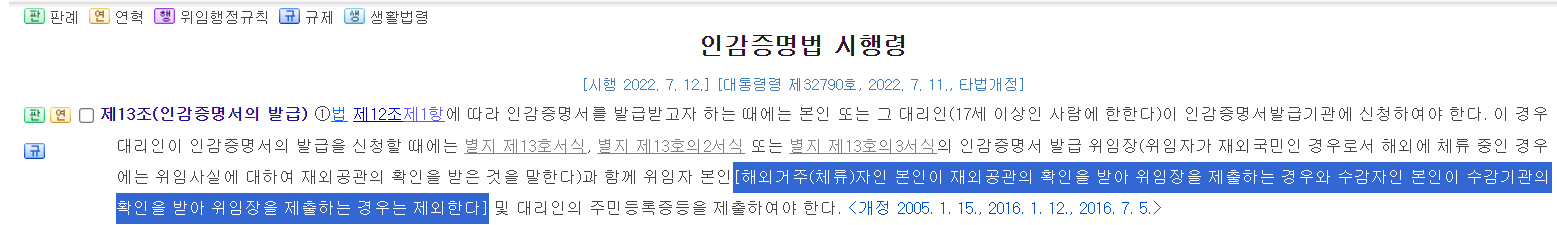 국가법령정보센터에서 인감증명법 시행령 13조를 찾아보면 인감증명서 발급 시 본인 및 대리인의 주민등록증 등을 제출해야 하지만 해외거주(체류) 자인 본인이 재외공관의 확인을 받아 위임장을 제출하는 경우는 제출의무가 없다.