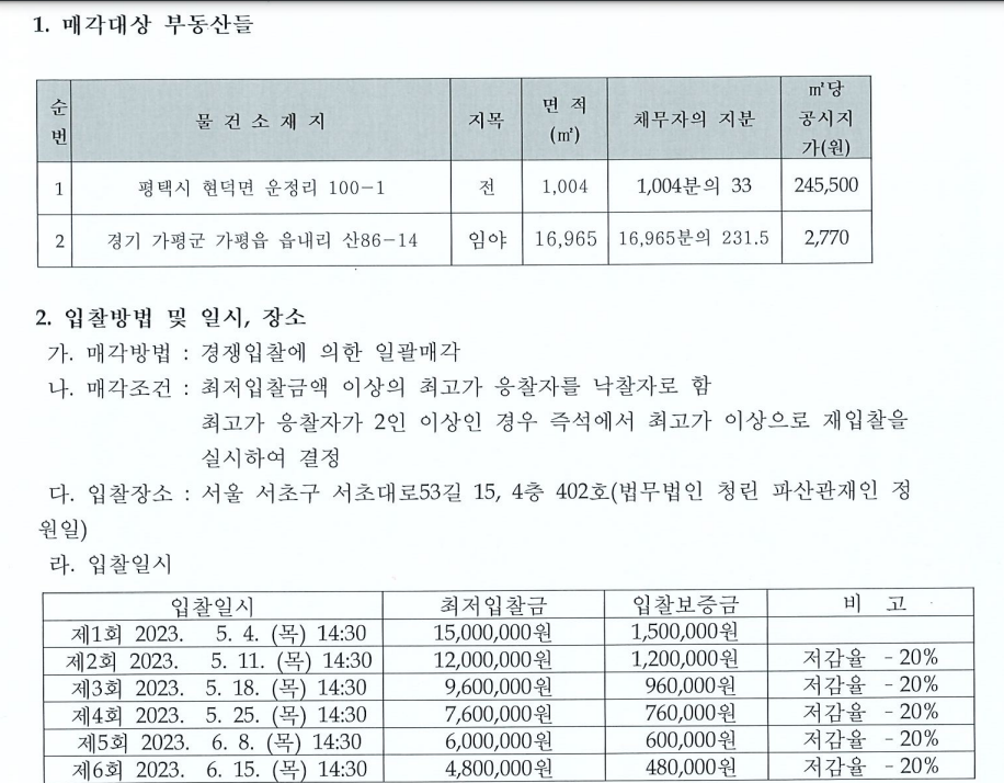 가평과 평택의 지분에 대한 일괄매각 물건이었습니다. 가평토지는 한강변의 임야로 경제적 가치가 없다고 판단되어 그냥 공짜로 얻는 땅이라고 생각하기로 했고 평택의 10평 지분의 가치만 고려하기로 하였습니다. 5월 4일 1회 차 유찰 후 5월 11일 2회 차에 1234만 원 입찰하였으나 1300만 원을 넘긴 분에게 패찰 하였습니다.