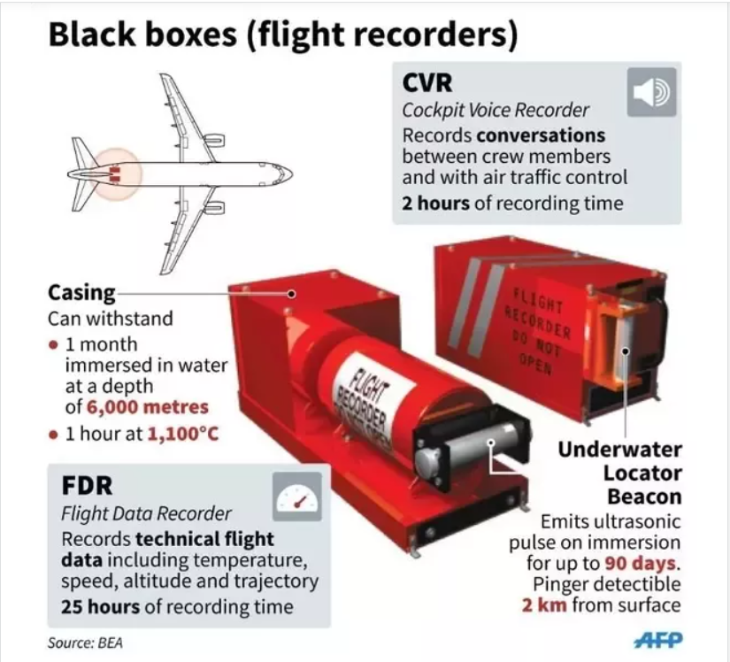 블랙박스는 항공기의 자세, 속도, 고도 등을 기록하는 FDR(Flight Data Recorder)과 조종실의 음성을 녹음하는 CVR(Cockpit Voice Recorder), 두 가지로 구성되어 있다.