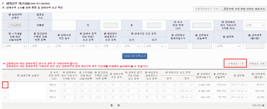 그러면 임대주택 호수별 임대 현황 및 임대주택 요건 확인란이 활성화됩니다. 각 순서대로 항목별 적용사항을 변경 후 "임대주택 등록하기" 버튼을 클릭합니다. 감면율은 1호 단기 30%, 1호 장기 75%, 2호 이상 단기 20%, 2호 이상 장기 50%입니다.