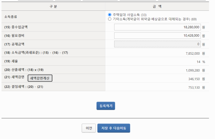 제 경우 산출세액이 1,099,280원 에서 346,150의 세액감면을 받아 결정세액은 753,130원이 되었습니다. "등록하기" 버튼을 누른 후 "저장 후 다음이동" 버튼을 클릭합니다.